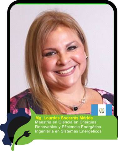 La M.Sc. Lourdes Socarrás Mérida es ingeniera mecánica y Magister en Ciencias en Energías Renovables con más de 20 años de experiencia en los campos de la energía renovable, eficiencia energética, sostenibilidad y planificación energética. Actualmente se desempeña como Directora del Instituto de Recursos Energéticos (IRE) de la Universidad Galileo, donde ha liderado el desarrollo de programas académicos de maestría, postgrado y formación técnica orientados a la transición energética y la gestión ambiental.