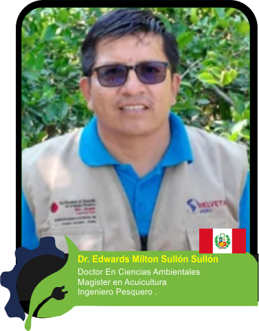 El Dr. Edwards Milton Sullón Sullón es Doctor en Ciencias Ambientales, Magíster en Acuicultura e Ingeniero Pesquero con amplia trayectoria en investigación, innovación tecnológica y gestión sostenible en el sector acuícola y agroacuícola. Actualmente se desempeña como Gerente de la empresa COLIDERS E.I.R.L. y ha liderado diversos proyectos de desarrollo e innovación financiados por el Programa Nacional de Innovación en Pesca y Acuicultura (PNIPA – Perú).