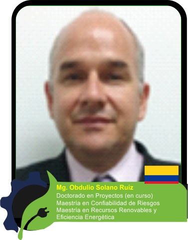 El Mg. Obdulio Solano Ruiz es Ingeniero de Sistemas y Especialista en Telecomunicaciones, y maestrias en Confiabilidad y Riesgo (Universidad de Las Palmas de Gran Canaria) y Recursos Renovables y Eficiencia Energética (Universidad a Distancia de Madrid). Actualmente cursa el Doctorado en Proyectos en la Universidad Internacional Iberoamericana de México.